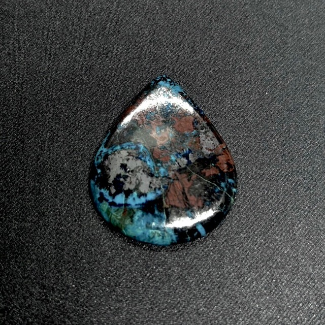 商品名 : アズライト&クリソコーラ(通称) 産地 : ペルー 重さ:約 65.8ct 大きさ:40 x 33 x 4.4 mm 色合い:ブラック、ブラウン、アクアブルー カット:マロンカボッション 鑑別:無し タグ : ホワイト 模様のある天然石のなかでは強さとモダンさを感じさせるアズライトクリソコラと呼ばれるアイテムで、アクアブルーのアズライト、ブラックカラーのマトリックス、メタリックなヘマタイトやブラウンカラーのマトリックス、ダークグリーンのマラカイトを走らせたフィフスエレメントが特徴です。 少しスピリチュアルなお話しになるとはおまいますが、このタイプのアズライトやブロンザイトと呼ばれる天然石は手に持った時に男性的なクールな強さを受け取ります。(人に寄ると思いますが...) 力強さを感じるのでファセットカットの宝石をアクセントに合わせても良さそうです。 ペンダントトップやブレスにするとカッコイイ大きめサイズです。 ご注意①様々な角度、ライティングで撮影いたしましたのでご確認下さい。 ②大きめの天然石になりますので、サイズと重さは測る場所、湿度などにより(サイズは2〜3mm以下、重さは±0.20ct〜±2.0ct前後)誤差が出る場合がございますのでご了承ください。 ③個性を楽しむための天然石には、研磨時の残り傷、磨き残し、糊残り、クラック、不純物がございますので、写真でご確認頂き、神経質な方の方のお買い求めはご遠慮下さい。 ④すり替え、故意による破損返品などの防止のため、基本的に返品は不可とさせて頂いております。