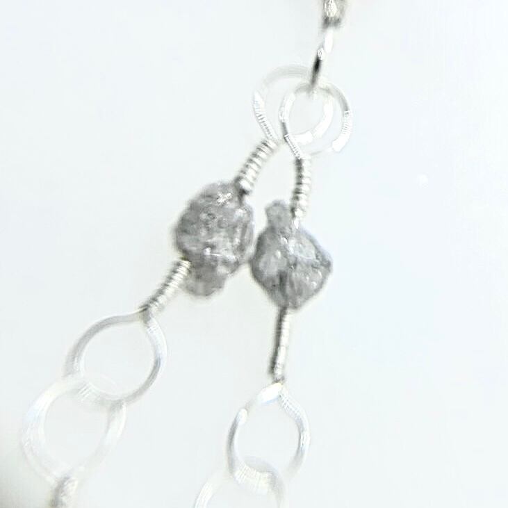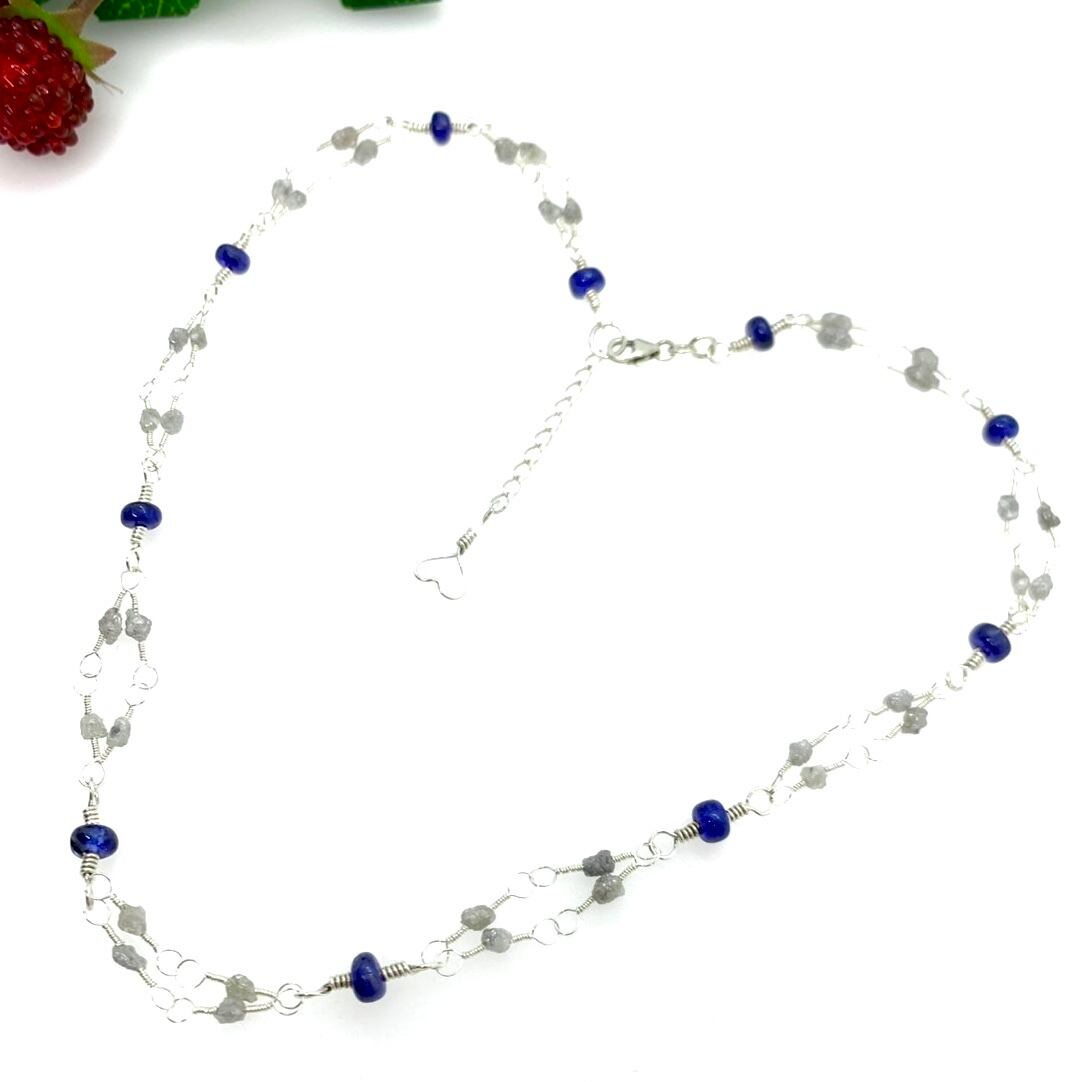 silver950と925のwireをひと目ひと目手編みして作られたダイヤモンド原石と、コーンフラワーブルー色が最も美しいとされるサファイアを贅沢に施したネックレスになります。