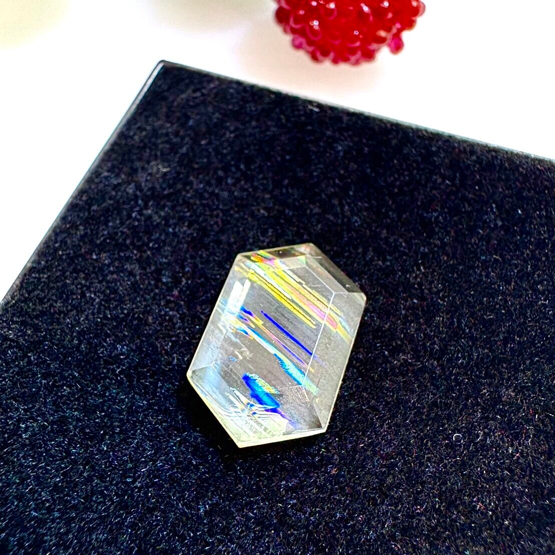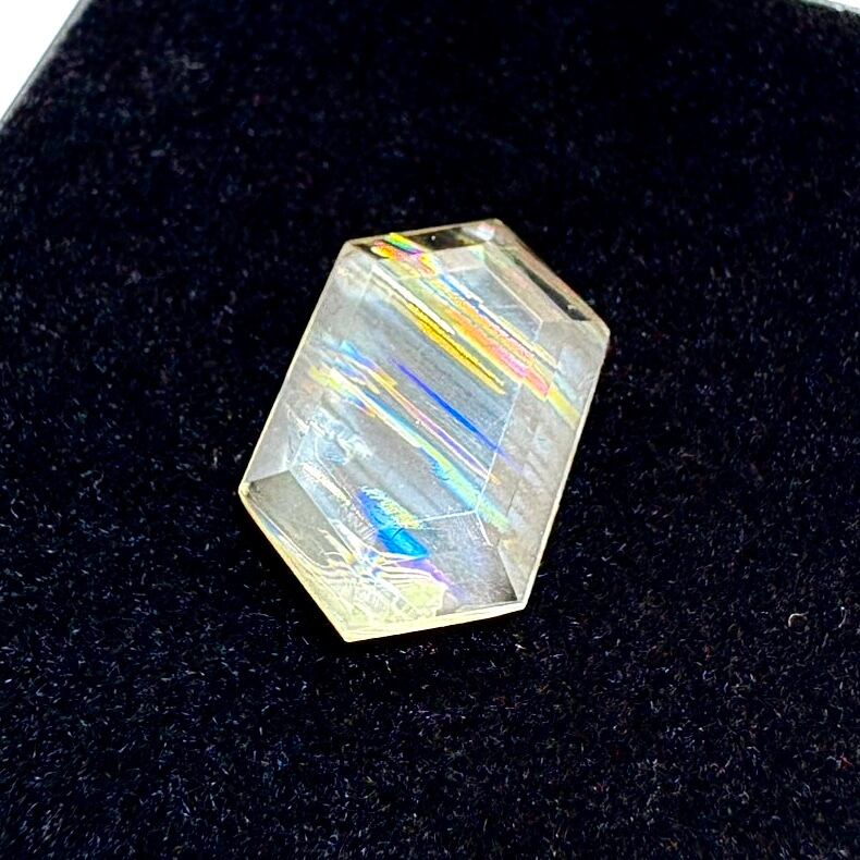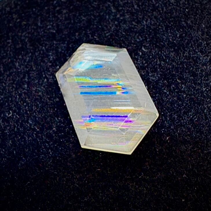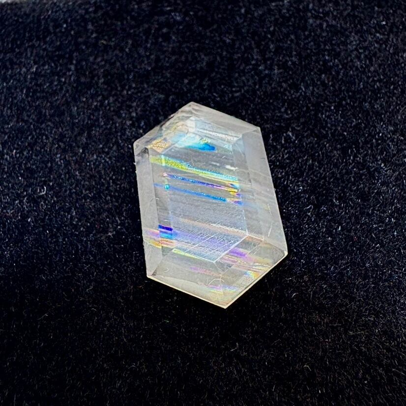 透明感の高いムーンストーンの内部に特徴的なレインボーレコードがしっかり表れている神秘的なピースで、ラブラドレッセンスの様な模様にも見えますが深さを持つと幾重にも虹のラインが浮かびとても美しさが際立ちます。