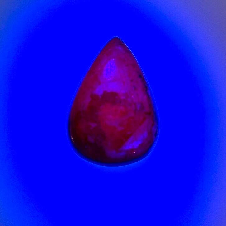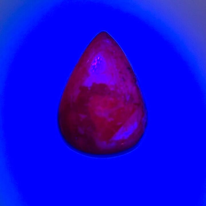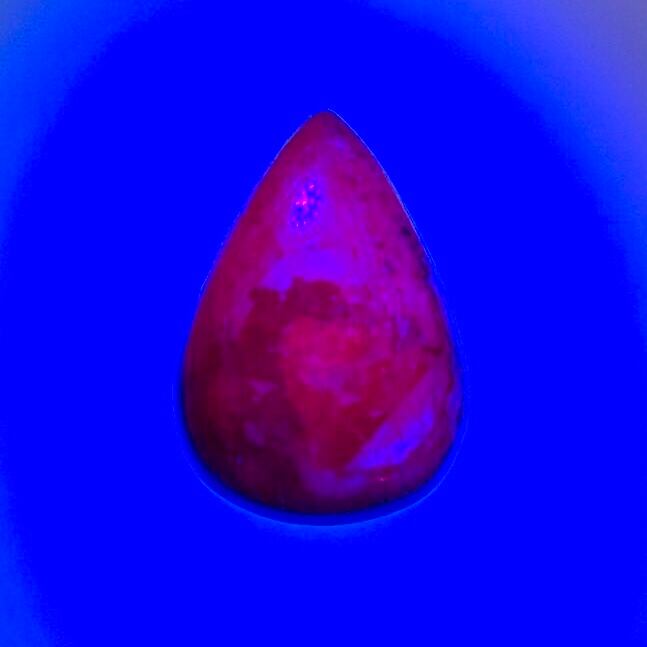 このタイプの「ルビー」にはインドスタールビーと呼ばれる小豆色の天然石もありますが、赤いコランダムでもインドスタールビーはマンガンを含まず蛍光しないので、鑑別ではヴァイオレットスターサファイアとなります。