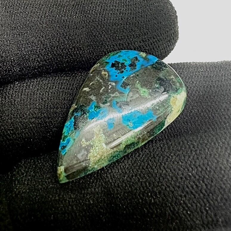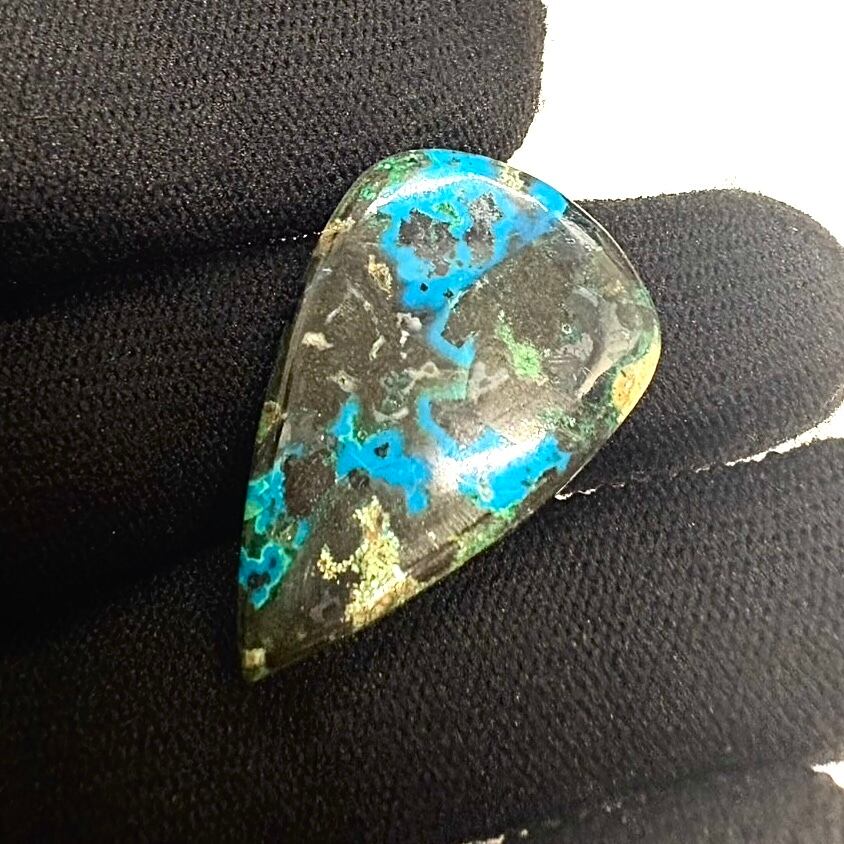 イナズマ模様の珍しいシャタカイトの中にグリーンのマラカイト...と思いきやクロムダイオプサイト、黒い部分ブラックカルコサイトが入った珍しいピース。