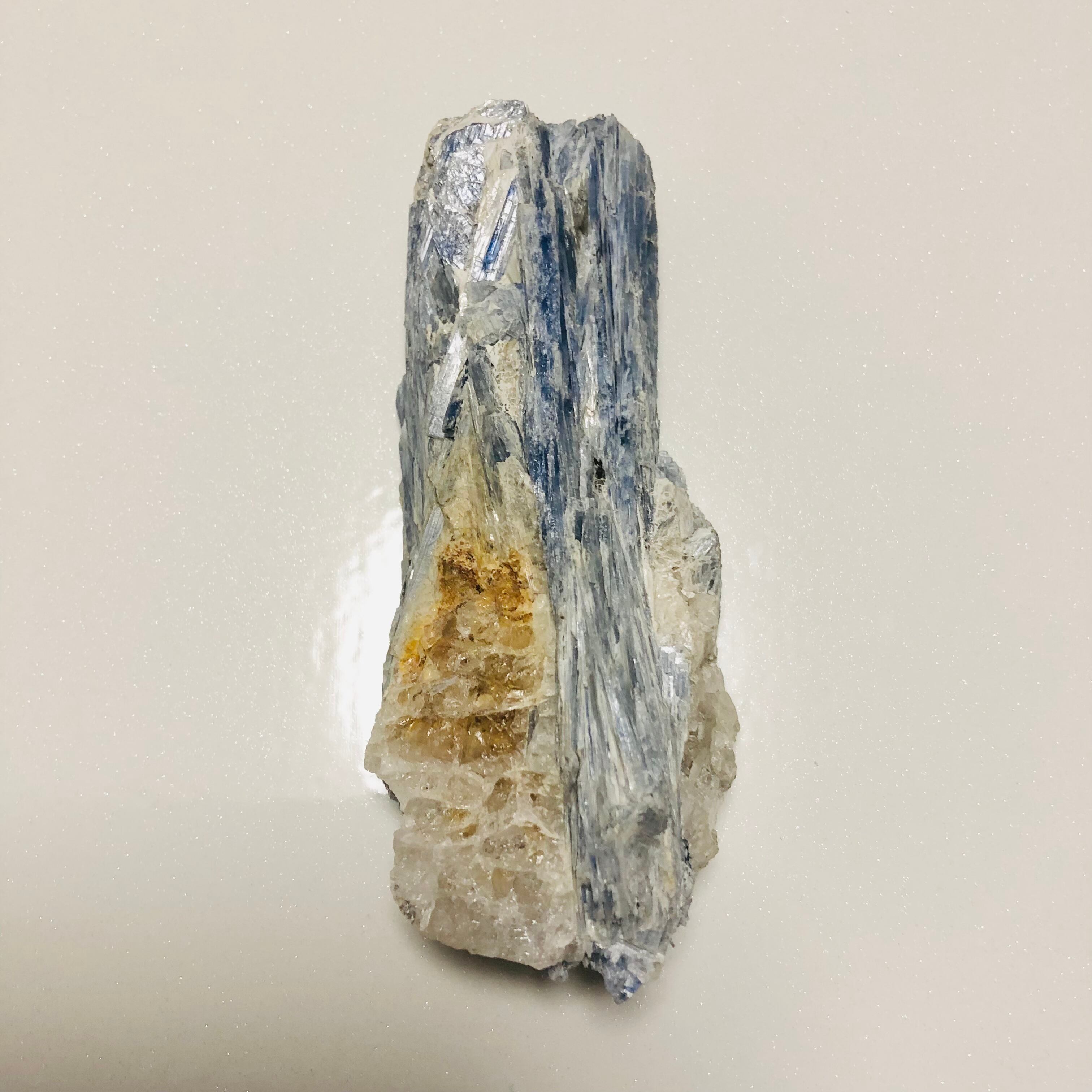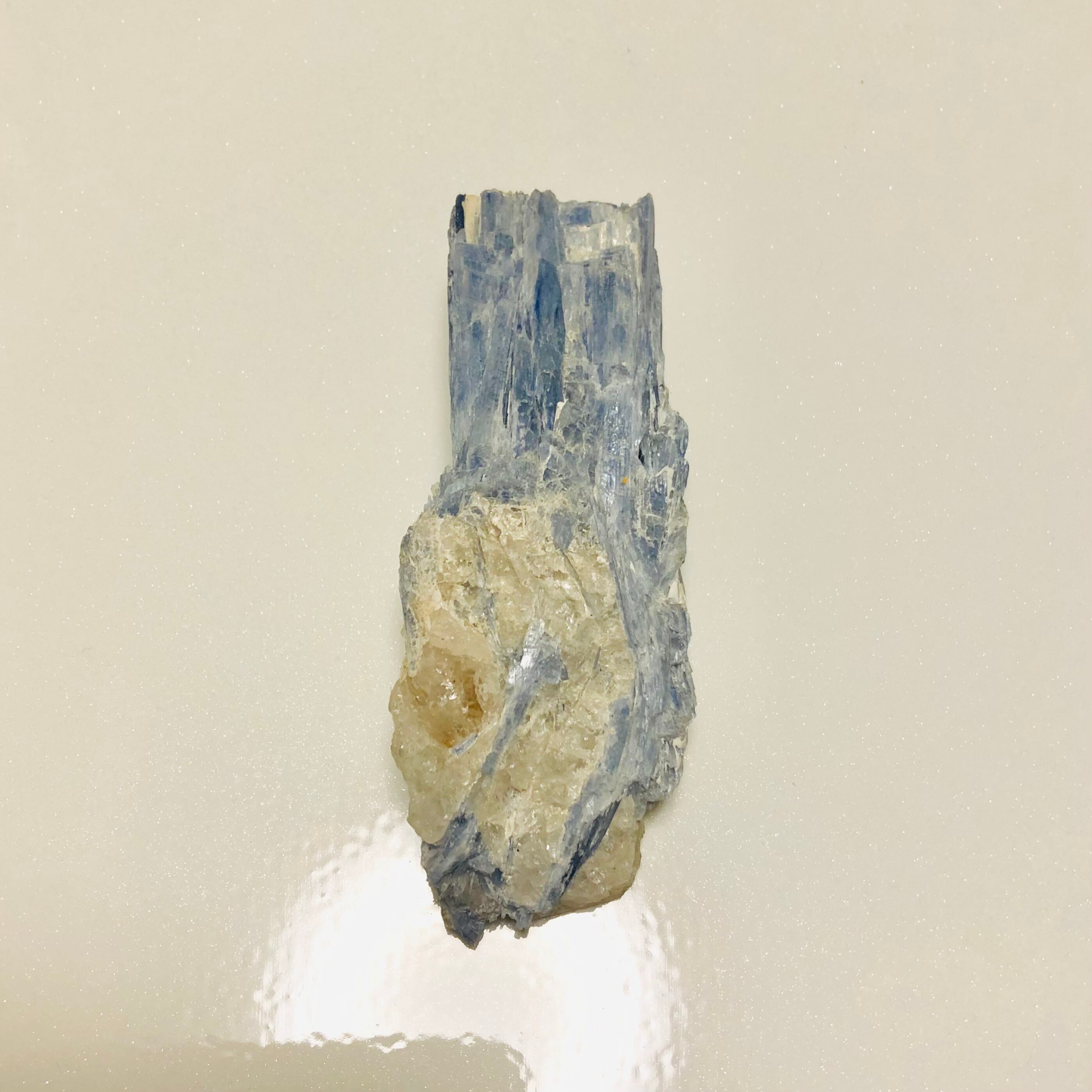 カイヤナイトと、水晶が合わさる結晶の集合体なので、カットできれば絵画の様な面白いルースになるかも?